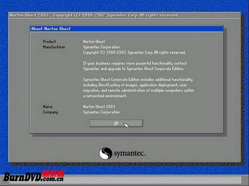 - 第2步,打開(kāi)Norton Ghost 2003程序主界面,首先會(huì)彈出一個(gè)軟件信息提示框,單擊OK按鈕將其關(guān)閉,如圖2009012389所示。
