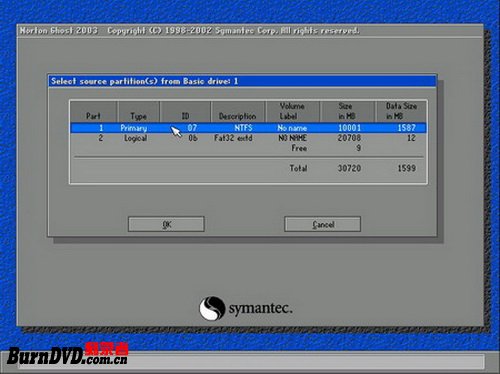 - 第5步,打開(kāi)“Select source partition(s) from Basic drive:1(在第一塊硬盤(pán)中選擇源分區(qū))”對(duì)話框,單擊選中系統(tǒng)所在分區(qū)(通常為第一個(gè)分區(qū))并單擊OK按鈕,如圖2009012392所示。
