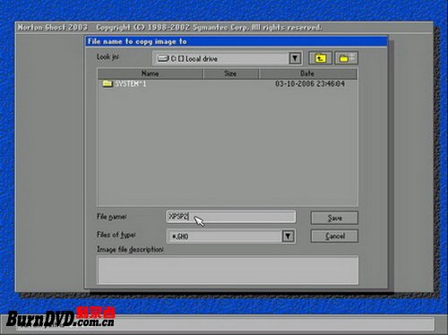 - 第7步,單擊“File name(文件名)”編輯框,輸入合適的文件名稱(如XPSP2)。然后單擊“Save(保存)”按鈕,如圖2009012394所示。