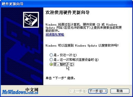 小提示:一般情況下,用戶應(yīng)該事先搞清楚這些“未知設(shè)備”具體是指什么設(shè)備。 - 第3步,打開“硬件更新向?qū)?rdquo;,在歡迎向?qū)ы撝羞x中“否,暫時不”單選鈕,并單擊“下一步”按鈕,如圖20100409125所示。