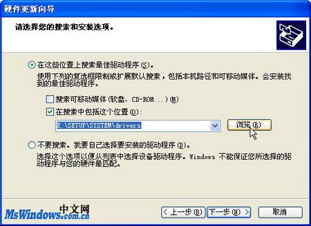 - 第5步,打開“請選擇您的搜索或安裝選項”向?qū)ы摚x中“在這些位置上搜索最佳驅(qū)動程序”單選鈕,并選中“在搜索中包括這個位置”復(fù)選框。然后單擊“瀏覽”按鈕選擇驅(qū)動程序的備份文件夾,如圖20100409127所示。