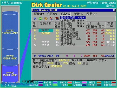 小提示:在Disk Genius主界面中的硬盤分區(qū)情況一目了然,左邊柱狀圖是分區(qū)情況,右邊則分區(qū)的詳細(xì)信息。另外還在底部提供了顏色對(duì)照表,以幫助用戶理解磁盤分區(qū)類型。 - 第2步,進(jìn)入Disk Genius程序主界面,按鍵盤上的Alt+T組合鍵彈出“工具”菜單,按上下方向鍵選擇“備份分區(qū)表”命令并按回車鍵(用戶也可以直接按F9鍵),如圖2010040985所示。