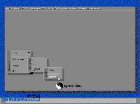 - 第1步,使用其中一張啟動(dòng)盤啟動(dòng)電腦,成功引導(dǎo)系統(tǒng)后將自動(dòng)進(jìn)入Ghost操作界面。然后依次指向Peer to peer→TCP/IP菜單,并單擊Master選項(xiàng),如圖20100414163所示。