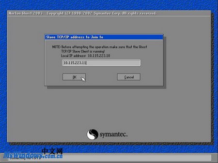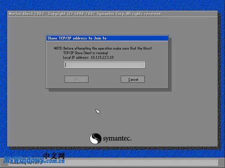 小提示:因?yàn)槭褂玫氖锹?lián)網(wǎng)支持啟動(dòng)盤引導(dǎo)的系統(tǒng),因此TCP/IP選項(xiàng)為可用。并且在TCP/IP選項(xiàng)的下一級菜單中有Master和Slave兩個(gè)選項(xiàng),分別表示將該電腦作為主機(jī)還是客戶機(jī)。 - 第2步,打開Clone TCP/IP Address to join to對話框,在編輯框中等待輸入客戶機(jī)的IP地址,如圖20100414164所示。