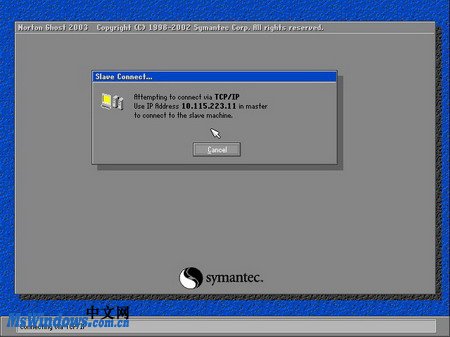 圖20100414164 等待輸入客戶機(jī)IP地址 - 第3步,使用另一張的啟動(dòng)盤啟動(dòng)另一臺電腦,進(jìn)入Ghost操作界面后依次指向Peer to peer→TCP/IP菜單,并單擊Slave選項(xiàng),將此電腦作為客戶機(jī)使用。可以通過Ghost界面查看到本機(jī)所使用的IP地址,如圖20100414165所示。