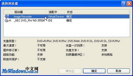 - 第2步,打開“選擇刻錄器”對話框,在“驅(qū)動器”列表中單擊選中Image Recorder選項,并單擊“確定”按鈕,如圖2010041452所示。