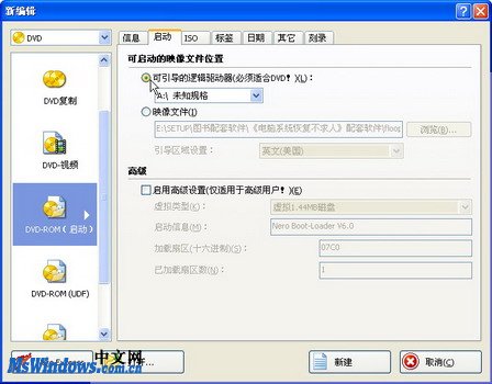 圖2010041452 選擇映像刻錄器 - 第3步,返回程序主窗口,依次單擊“文件”→“新建”菜單命令。打開“新編輯”對話框,首先在對話框左上方的盤片類型列表中選中DVD選項,然后在刻錄類型列表中單擊“DVD-ROM(啟動)”圖標。在“啟動”選項卡中選中“可引導(dǎo)的邏輯驅(qū)動器”單選鈕,并單擊“新建”按鈕,如圖2010041453所示。