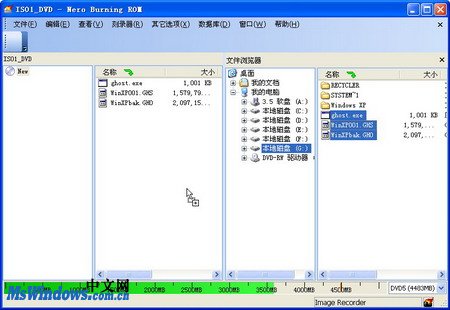圖2010041453 選擇可引導(dǎo)的驅(qū)動器 - 第4步,打開添加刻錄文件窗口,在“文件瀏覽器”窗格中找到要刻錄的系統(tǒng)分區(qū)映像文件和Ghost 2003主程序,并將其拖曳到ISO1_DVD窗格中,如圖2010041454所示。