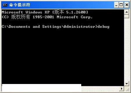 - 在開始菜單中依次單擊“所有程序”→“附件”→“命令提示符”菜單項,打開“命令提示符”窗口。輸入命令行debug并按回車鍵,如圖所示。
