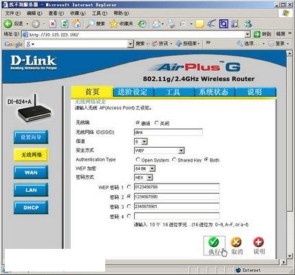 使用無線路由器組建無線局域網(wǎng)后,默認(rèn)情況下有效范圍內(nèi)的無線網(wǎng)絡(luò)用戶都可以連接到無線網(wǎng)絡(luò)中,用戶可以通過在無線路由器中設(shè)置無線網(wǎng)絡(luò)密碼限制無線用戶連接到無線網(wǎng)絡(luò)。以D-Lin的DI-624+A為例,設(shè)置無線網(wǎng)絡(luò)密碼的步驟如下所述: