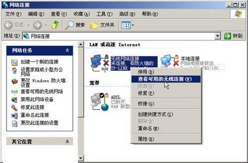 - 在桌面上右鍵單擊“網(wǎng)上鄰居”圖標(biāo),選擇“屬性”命令。在打開的“網(wǎng)絡(luò)連接”窗口中右件單擊“無線網(wǎng)絡(luò)連接”圖標(biāo),并選擇“查看可用的無線連接”命令,如圖所示。