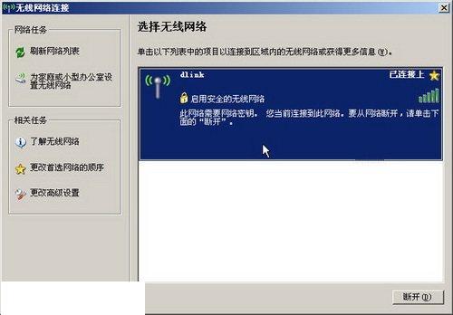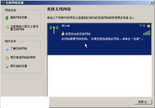 - 打開“無線網(wǎng)絡(luò)連接”對(duì)話框,如果無線網(wǎng)絡(luò)列表中沒有任何無線網(wǎng)絡(luò),則單擊“刷新網(wǎng)絡(luò)列表”按鈕查找無線網(wǎng)絡(luò)。然后單擊查找到的無線網(wǎng)絡(luò)(本例無線網(wǎng)絡(luò)SSID名稱為dlink),并單擊“連接”按鈕,如圖所示。