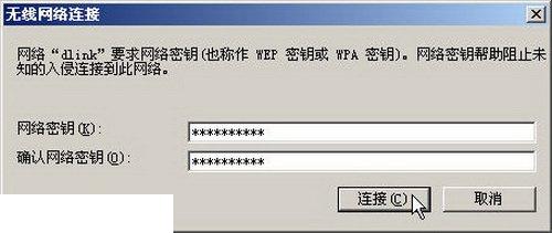 - 打開無線網(wǎng)絡(luò)連接密碼對(duì)話框,在“網(wǎng)絡(luò)密鑰”編輯框中輸入事先在無線路由器中選中的一組密碼,并在“確認(rèn)網(wǎng)絡(luò)密鑰”編輯框中重復(fù)輸入密碼。輸入完畢單擊“連接”按鈕,如圖所示。