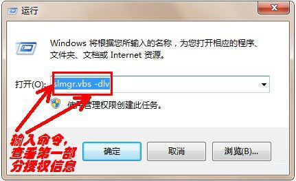 使用Win7功能鍵+R組合鍵,打開運行對話框。第一部分輸入“slmgr.vbs -dlv”程序代碼段,運行打開。我們即可以繼續(xù)下一步查詢。