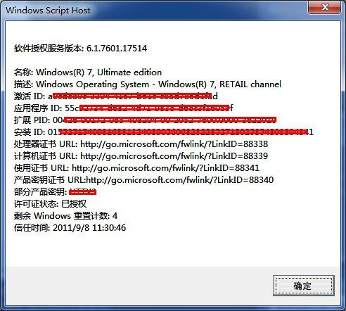 這樣,通過兩個方式的查詢,我們比較完整地了解了本機Win7系統(tǒng)的授權(quán)情況和多項的授權(quán)信息提供。