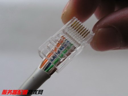 圖2008112740 將RJ-45插頭插入壓線插槽 - 第5步,完成雙絞線一端的制作工作后,按照相同的方法制作另一端即可。注意雙絞線兩端的芯線排列順序要完全一致,如圖2008112741所示。