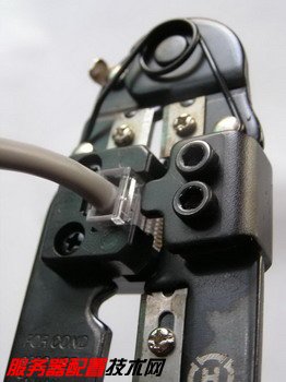 圖2008112739 將雙絞線插入RJ-45插頭 - 第4步,將插入雙絞線的RJ-45插頭插入網(wǎng)線鉗的壓線插槽中,用力壓下網(wǎng)線鉗的手柄,使RJ-45插頭的針腳都能接觸到雙絞線的芯線,如圖2008112740所示。