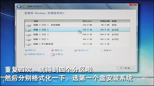 - 重復(fù)四次,就得到本個分區(qū)(當(dāng)然硬盤隨便你自己分幾個盤),然后分別格式化一下,選第一個盤安裝系統(tǒng)。