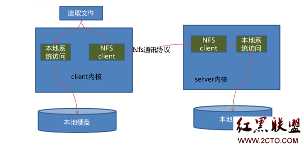 使用 NFS 客戶端可以透明的地訪問(wèn)服務(wù)器端的文件。 NFS 也是通過(guò) mount 來(lái)實(shí)現(xiàn),底層是通過(guò) NFS 通信協(xié)議實(shí)現(xiàn)。基本原理: