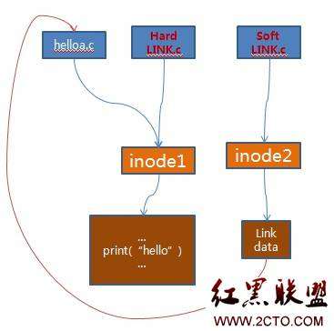 從圖上可以看出硬鏈接和軟鏈接的區(qū)別: