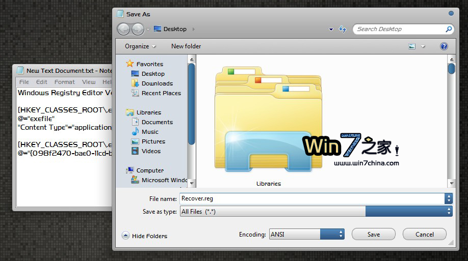 把上述文本輸入記事本,另存為“exe關聯(lián)恢復.reg”文件,留作備份。