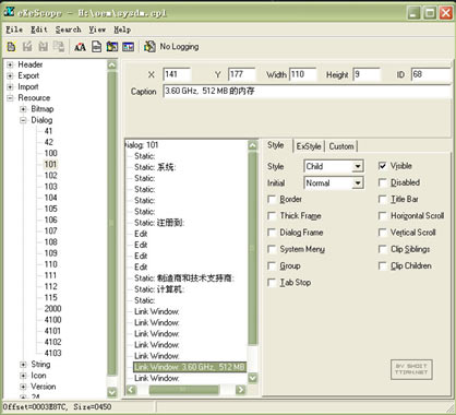 3,具體為改幾個Link Window屬性:將第4和第5個的Visible去掉,從第1個到3個和第6個到第9個的link Window座標分別改為(129,137);(141,163);(141,149);第六(141,177);再改下Caption="3.60 GHz, 512 MB 的內(nèi)存";(141,229);(141,241);(141,253);保存后退出。