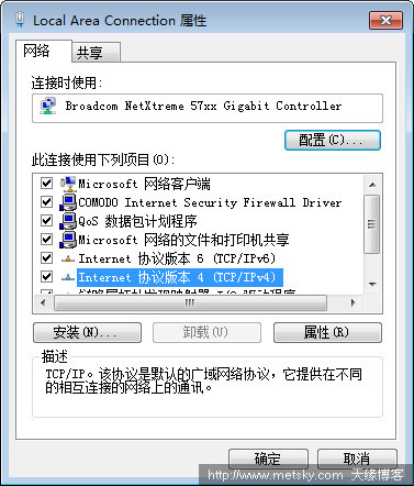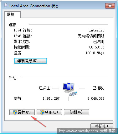 2、在打開的本地連接(Local Area Connection) 屬性窗口中,點擊“屬性”。