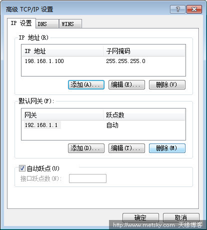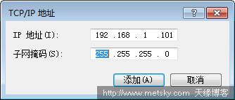 點擊上圖中的添加按鈕,輸入新的IP地址和子網(wǎng)掩碼。