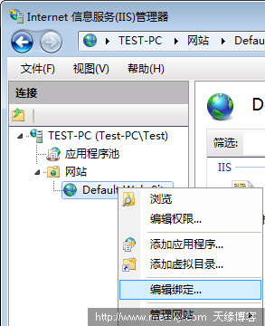 1、依次打開:控制面板\系統(tǒng)和安全\管理工具\Internet 信息服務(wù)(IIS)管理器 ,在網(wǎng)站圖標(biāo)上,鼠標(biāo)右鍵選擇“編輯綁定... ”,