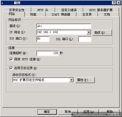 4、如果是Windows Server 2003,只需打開控制面板\管理工具\Internet 信息服務(wù)(IIS)管理器下,然后在網(wǎng)站圖標(biāo)上鼠標(biāo)右鍵選擇屬性,在IP地址 一欄選擇設(shè)置的IP地址即可,如下圖: