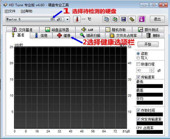 3.選擇待測(cè)試的硬盤(pán),然后選擇健康選項(xiàng)欄。