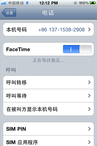 3、返回設(shè)置--電話--開啟FaceTime后(如果遇到還原后沒有facetime的情況,請(qǐng)先把SIM卡拔出,然后插入解決),點(diǎn)擊SIM卡應(yīng)用程序,進(jìn)入此欄目隨意點(diǎn)擊一個(gè)欄目后返回桌面