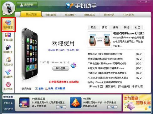 打開91手機(jī)助手后,界面右上方選擇 "程序管理"