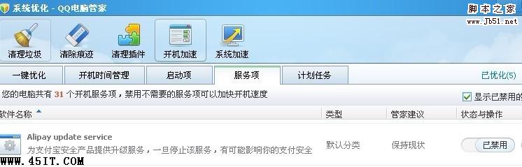 如有無360安全衛(wèi)士,也可以用QQ電腦管家,打開后選擇系統(tǒng)加速-開機加速-服務性-找到“Alipay Updater servie”設(shè)置為已禁用(如圖二,三),重啟電腦即可。