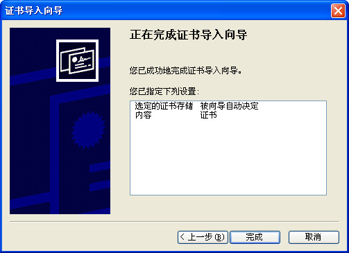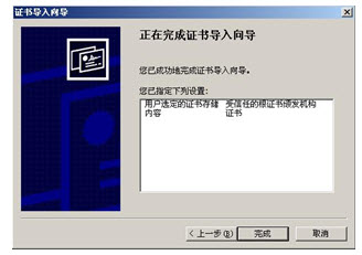 步驟五:在“選擇證書存儲”對話框中選擇“受信任的根證書頒發(fā)機構(gòu)”,點擊確定,此時返回到證書導(dǎo)入向?qū)ы撁?,如右圖所示: