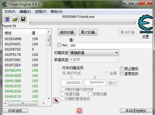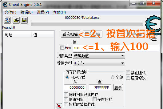現(xiàn)在開始搜索精確數(shù)值 100 數(shù)值中輸入 100 點擊 首次掃描 按鈕
