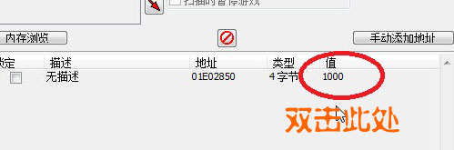 只有1個結(jié)果了,這個就是我們要找的內(nèi)存地址,雙擊將其加入到地址欄
