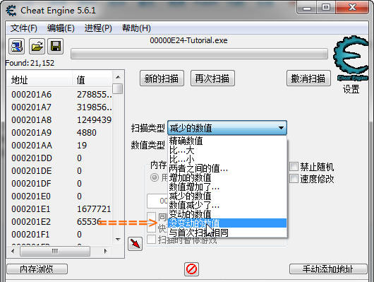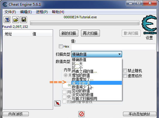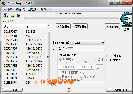 再回到Tutorial ,點擊 打我 => 掃描減少了的數(shù)值 => 掃描沒變動的數(shù)值 反復操作,最后就會只剩14個地址