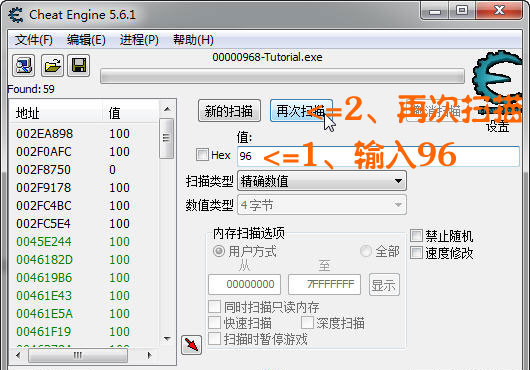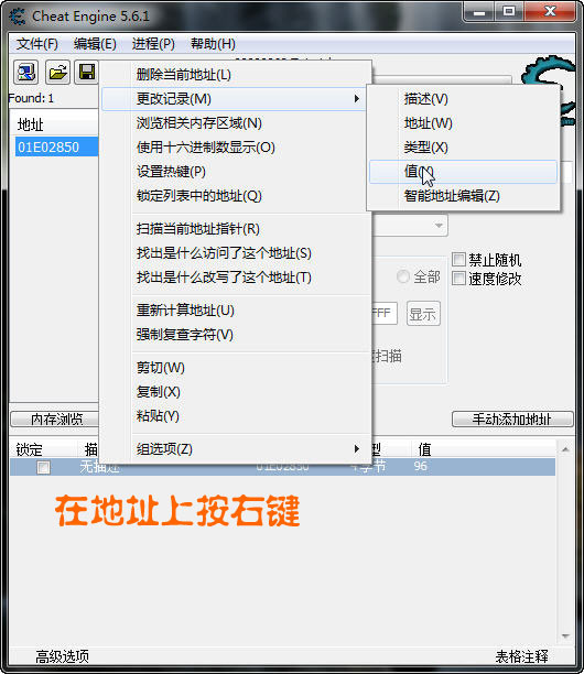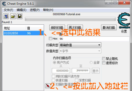 我們再輸入 96 點擊 再次掃描 按鈕 結(jié)果只剩1個(這就是我們要找的),我們雙擊此地址將其添加到地址欄: