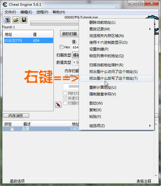 先找到血量的內(nèi)存地址,不會找的先去看前面幾關,這里就不重復了,然后 在地址上 右鍵=>找出是什么改寫了這個地址: