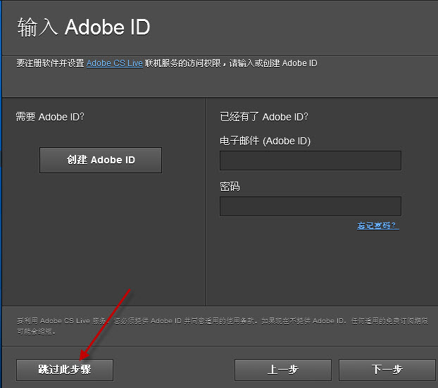 6、點(diǎn)擊下一步,會(huì)要求輸入adobe ID,不用管它,直接選擇"跳過此步驟"