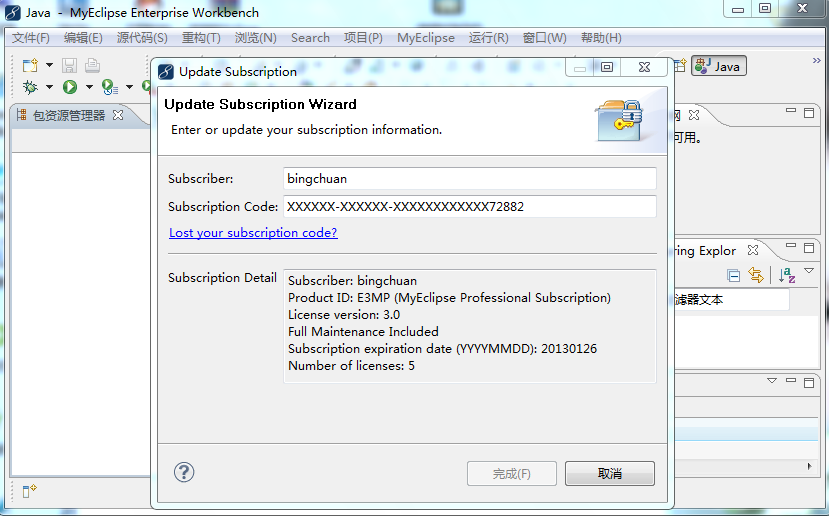 注冊方法:進(jìn)入MyEclipse主界面后,依次單擊“MyEclipse-->Subscription Information…”,在彈框中將用戶名和注冊碼填入即可。