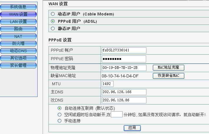 點(diǎn)擊WAN設(shè)置,(以PPPOE為例),填上自己的帳號(hào)和密碼.不知道的可以向安裝部門(mén)索取(一般會(huì)在安裝時(shí)給的安裝盤(pán)的背面寫(xiě)有)及MAC地址克隆(此項(xiàng)主要是為了應(yīng)對(duì)ISP將帳號(hào)和網(wǎng)卡MAC地址綁定的,克隆MAC為可上網(wǎng)電腦的真實(shí)MAC地址),及DNS主輔項(xiàng).(DNS添加到這里可以省確各個(gè)電腦上單獨(dú)再添加DNS的麻煩)