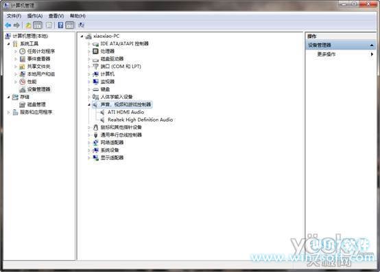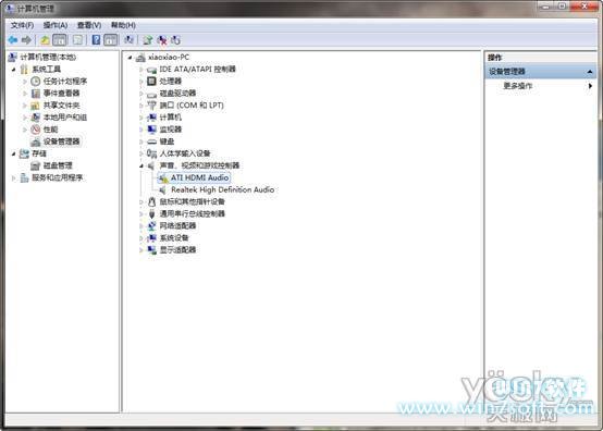 第二步,打開“設(shè)備管理器”,查看“聲音、視頻和游戲控制器”目錄。通常,你會(huì)發(fā)現(xiàn)設(shè)備顯示不正常。如下圖,Realtek High Definition Audio正常,但是ATI HDMI Audio一欄卻標(biāo)有黃色嘆號。