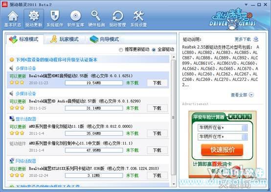 第三步,開啟驅(qū)動(dòng)精靈,建議下載最新的驅(qū)動(dòng)精靈2011 Beta 2。查看“驅(qū)動(dòng)更新”下的“多媒體設(shè)備”,界面中會(huì)提供完整的可以更新的驅(qū)動(dòng)列表。如下圖,Realtek瑞昱HDMI音頻驅(qū)動(dòng)2.55版;Realtek瑞昱HD Audio音頻驅(qū)動(dòng)2.57版。