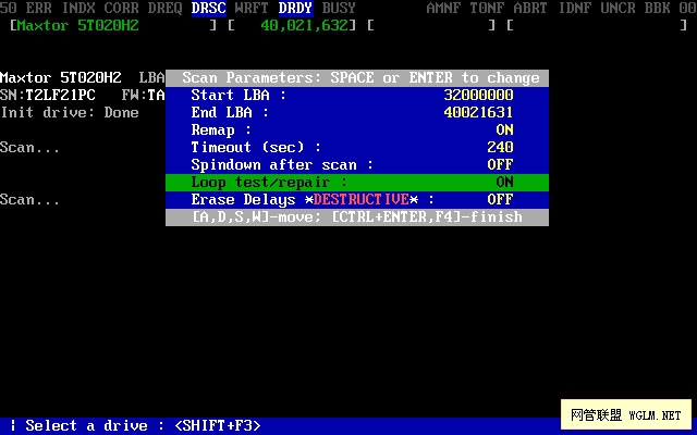 2.下面這個(gè)方法,沒(méi)耐心的朋友就不必看了。同上,先按SHIFT+F3掃描硬盤(pán)連接并選擇,按F4鍵,先用一般模式掃十遍以上,再用高級(jí)模式掃一變,具體方法在一般模式下將Loop the test/repair項(xiàng)選ON,執(zhí)行掃描