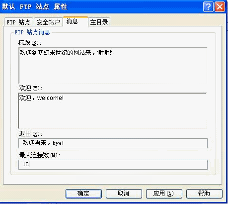 定義用戶(hù)訪問(wèn)FTP站點(diǎn)和退出站點(diǎn)時(shí)的信息以及最大連接數(shù),如圖: