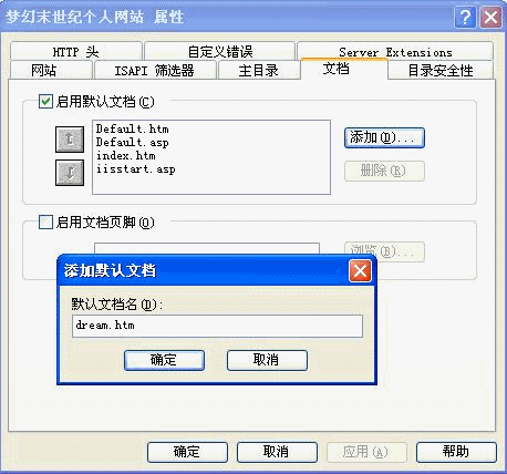設(shè)置“文檔”:確?!皢⒂媚J(rèn)文檔”一項(xiàng)已選中,再增加需要的默認(rèn)文檔名并相應(yīng)調(diào)整搜索順序即可。此項(xiàng)作用是,當(dāng)在瀏覽器中只輸入域名(或IP地址)后,系統(tǒng)會(huì)自動(dòng)在“主目錄”中按“次序”(由上到下)尋找列表中指定的文件名,如能找到第一個(gè)則調(diào)用第一個(gè);否則再尋找并調(diào)用第二個(gè)、第三個(gè)……如果“主目錄”中沒(méi)有此列表中的任何一個(gè)文件名存在,則顯示找不到文件的出錯(cuò)信息。如下圖:
