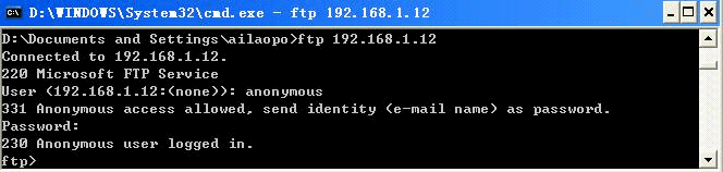 在運(yùn)行中,打開(kāi)cmd,然后輸入 ftp 192.168.1.12(剛才設(shè)置的IP地址)回車(chē),輸入用戶(hù)名anonymous。