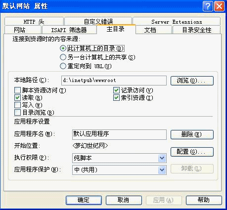 在上圖的主目錄中定義網(wǎng)頁(yè)內(nèi)容的來(lái)源,默認(rèn)如上圖,本地路徑可以根據(jù)你的需要設(shè)置,一般從安全性角度上考慮不要設(shè)置在系統(tǒng)分區(qū),可以在另外的分區(qū)重新建立一個(gè)路徑。